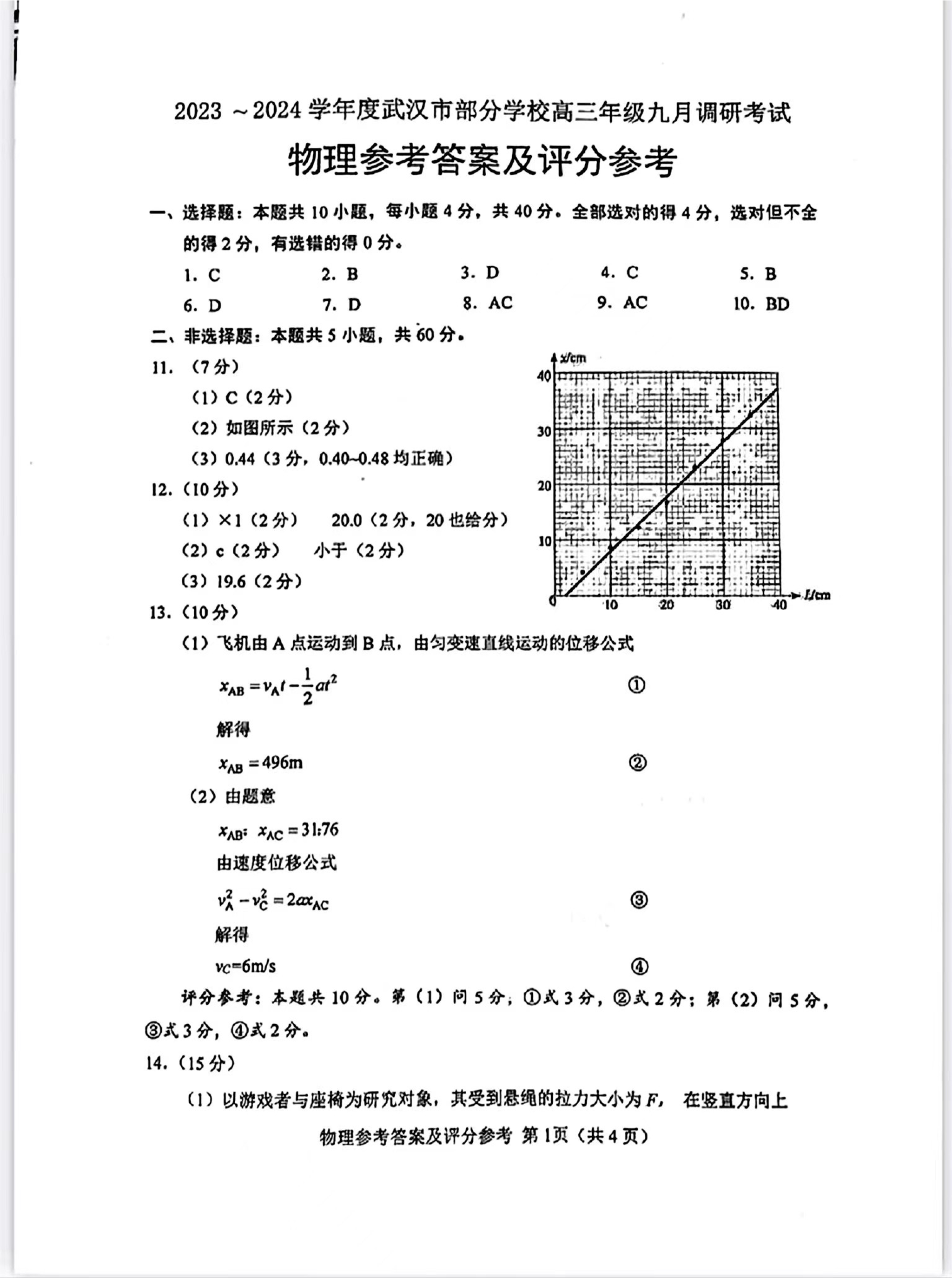 湖北省武汉市2024届部分学校高三年级九月调研考试+物理答案