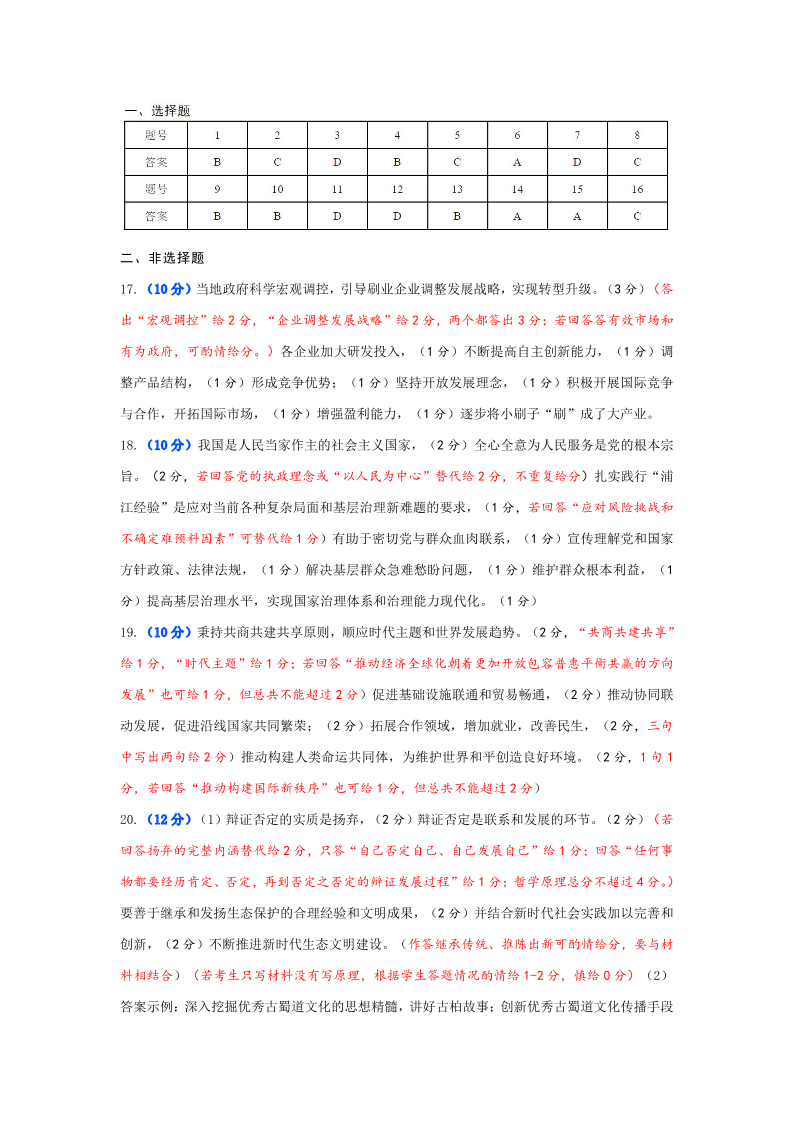 湖北省武汉市2024届部分学校高三年级九月调研考试+政治答案