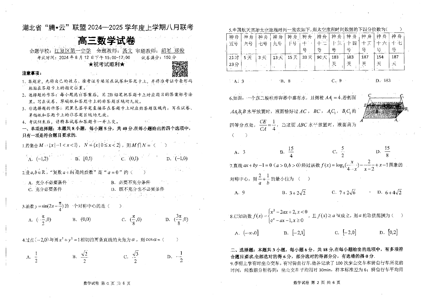 湖北省“腾·云”联盟2025届高三上学期八月联考+数学