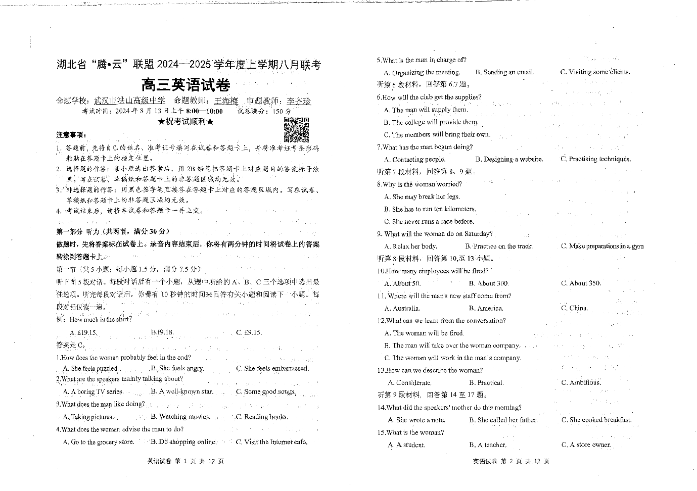 湖北省“腾·云”联盟2025届高三上学期八月联考+英语