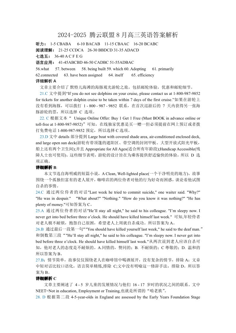湖北省“腾·云”联盟2025届高三上学期八月联考+英语答案