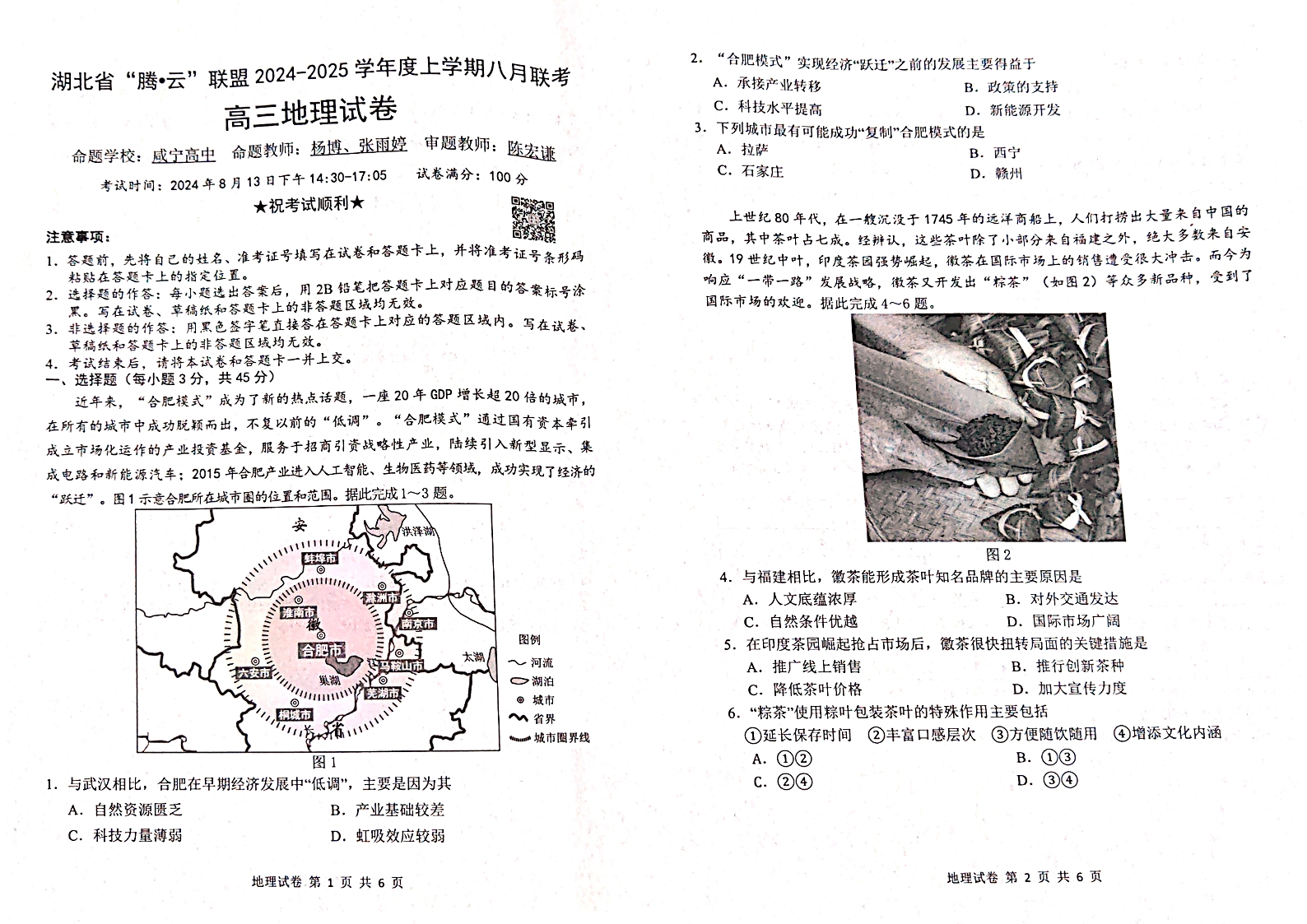 湖北省“腾·云”联盟2025届高三上学期八月联考+地理