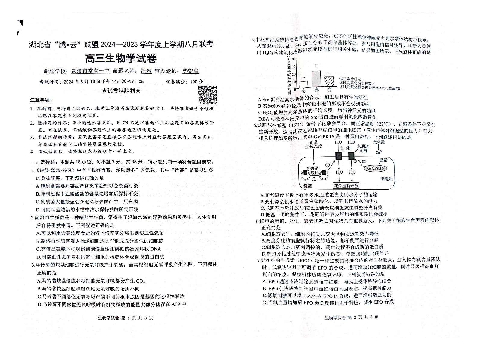 湖北省“腾·云”联盟2025届高三上学期八月联考+生物