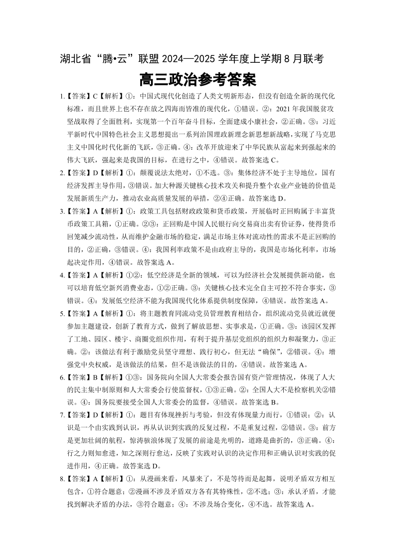 湖北省“腾·云”联盟2025届高三上学期八月联考+政治答案