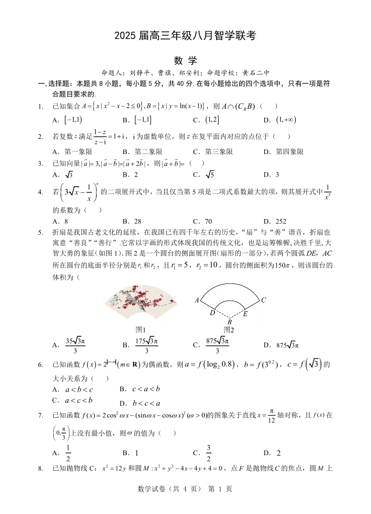 湖北省重点高中智学联盟2025届新高三8月联考考试+数学