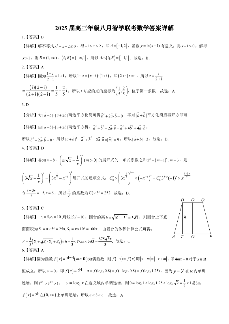 湖北省重点高中智学联盟2025届新高三8月联考考试+数学答案
