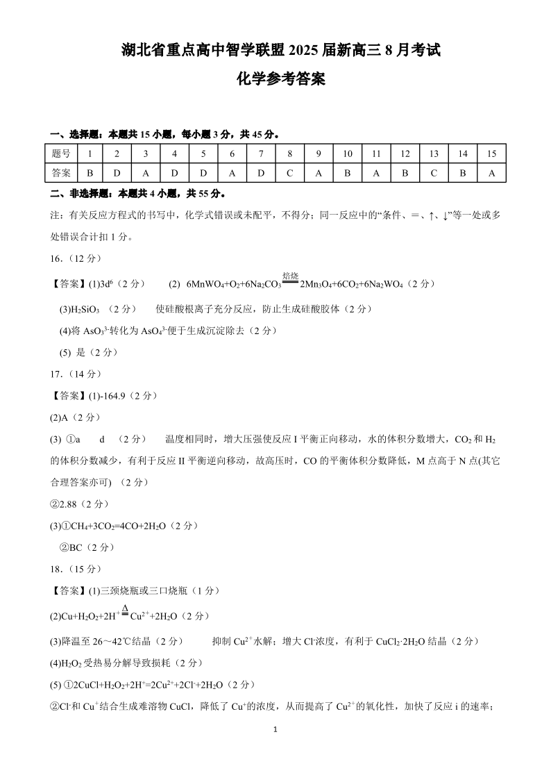 湖北省重点高中智学联盟2025届新高三8月联考考试+化学答案