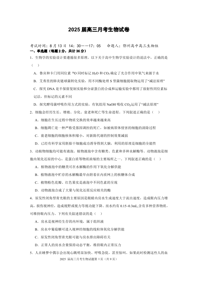 湖北省重点高中智学联盟2025届新高三8月联考考试+生物