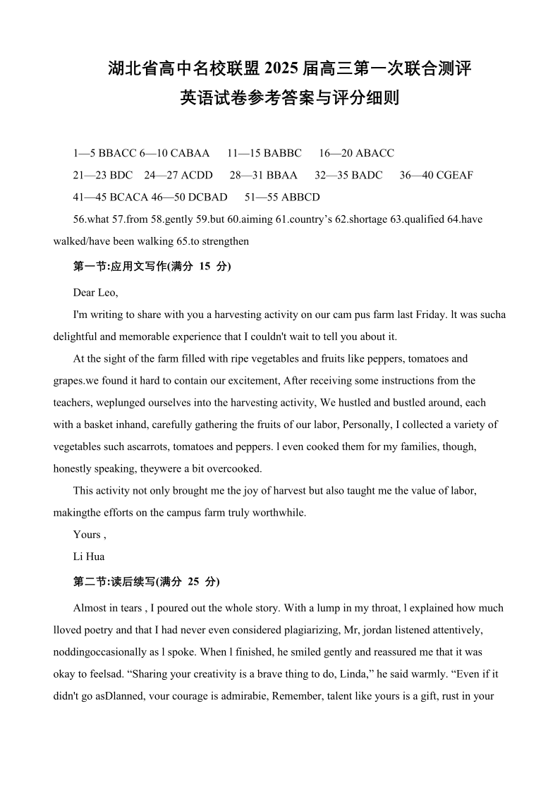 湖北省高中名校联盟2025届高三第一次联合测评+英语答案