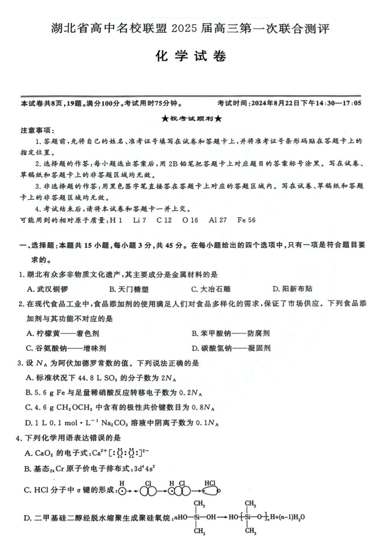 湖北省高中名校联盟2025届高三第一次联合测评+化学