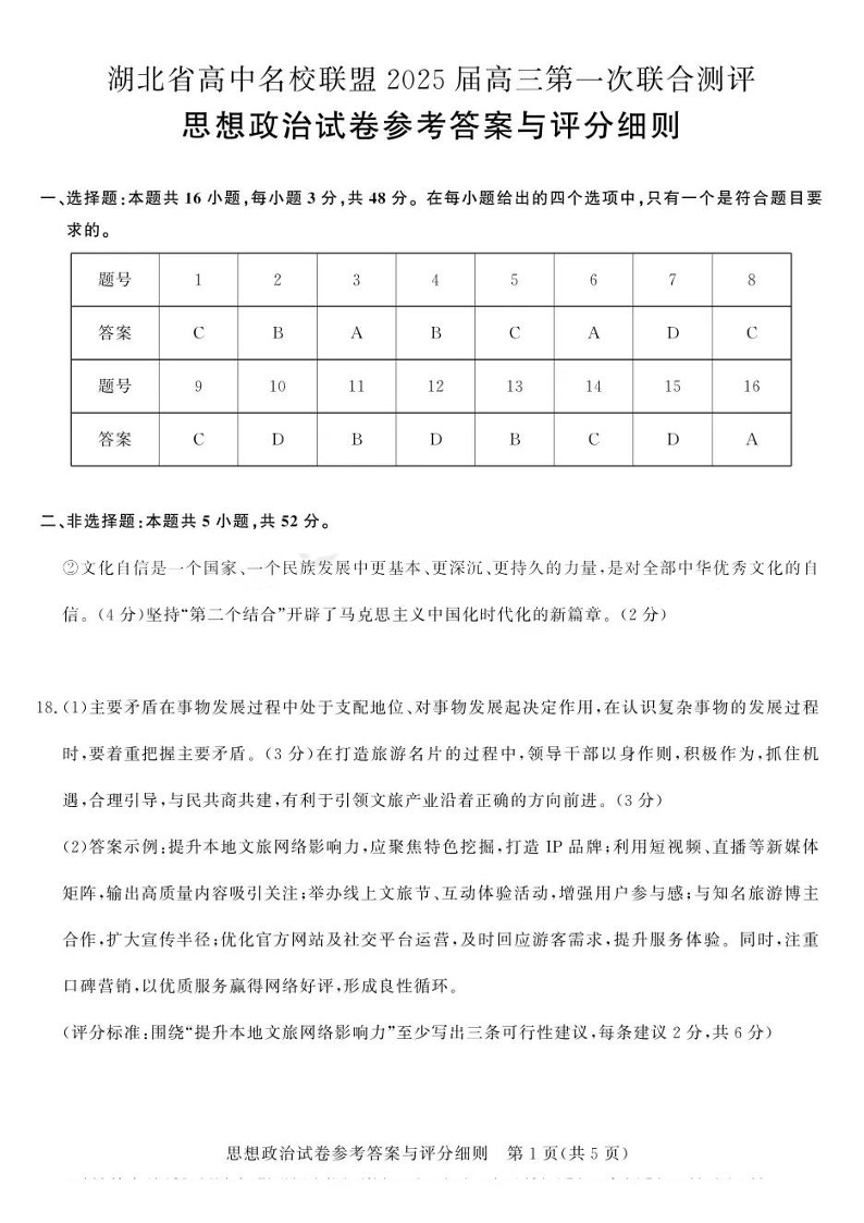湖北省高中名校联盟2025届高三第一次联合测评+政治答案