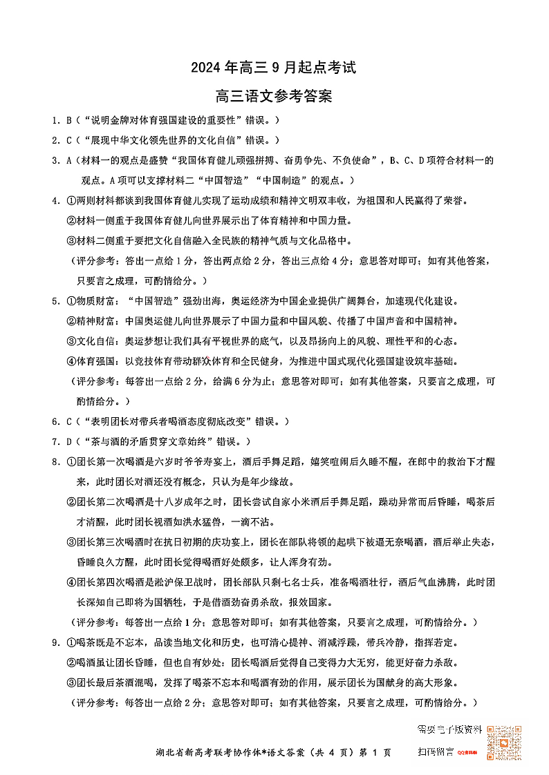 湖北省新高考联考协作体2025届高三上学期开学考试+语文答案