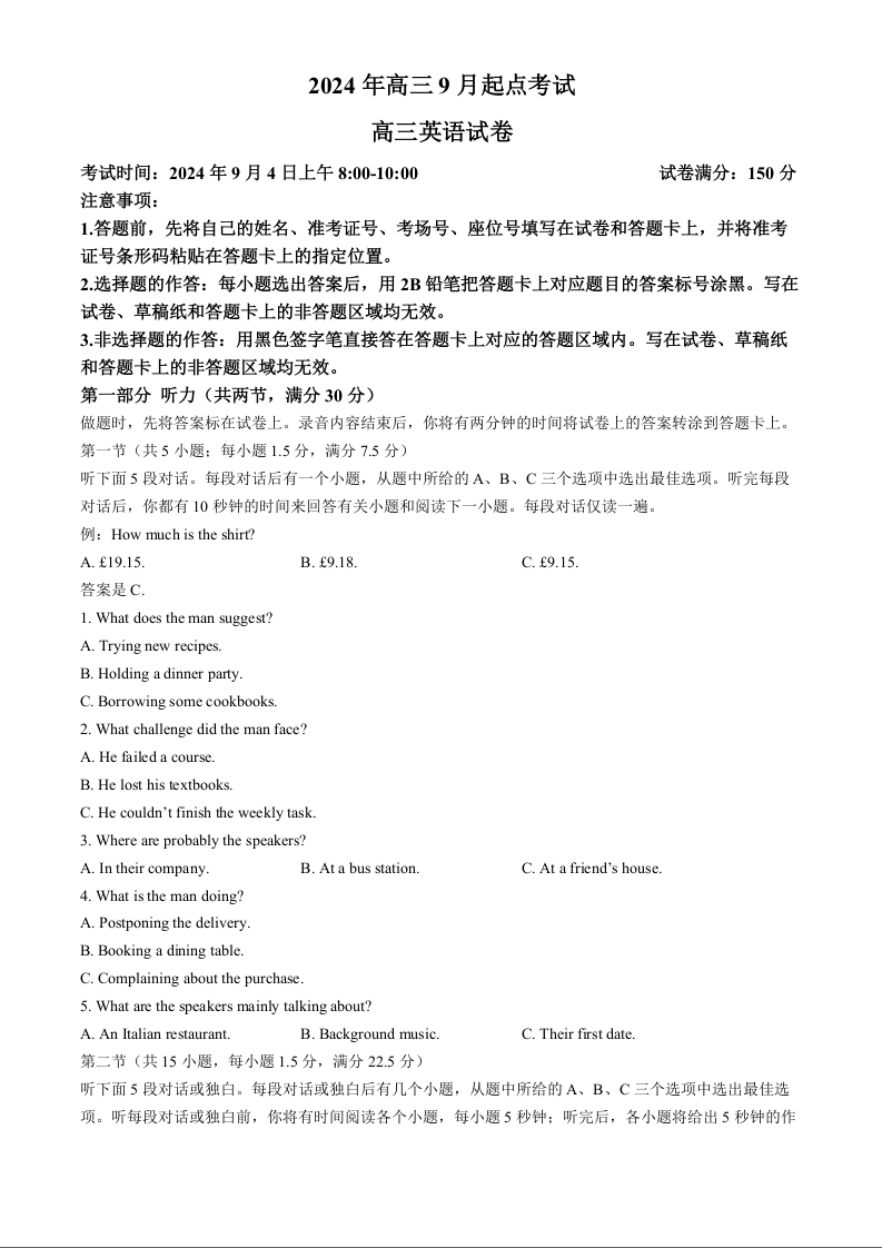 湖北省新高考联考协作体2025届高三上学期开学考试+英语
