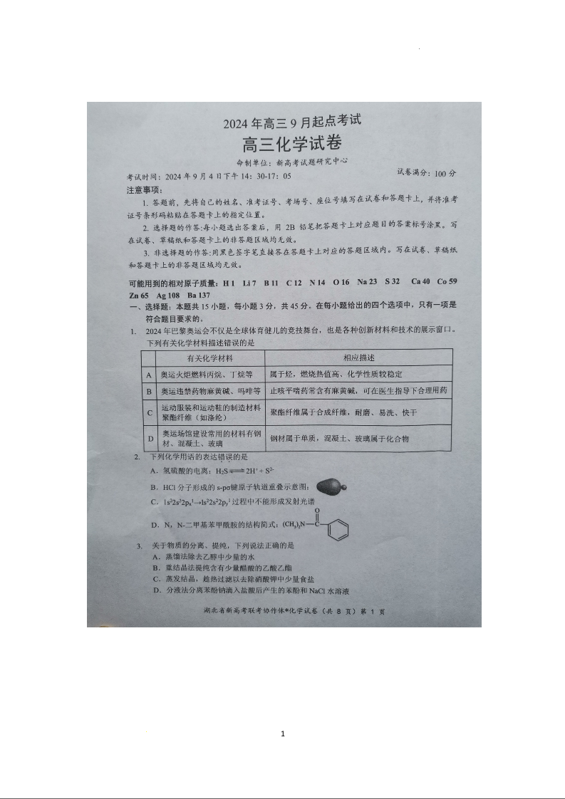 湖北省新高考联考协作体2025届高三上学期开学考试+化学