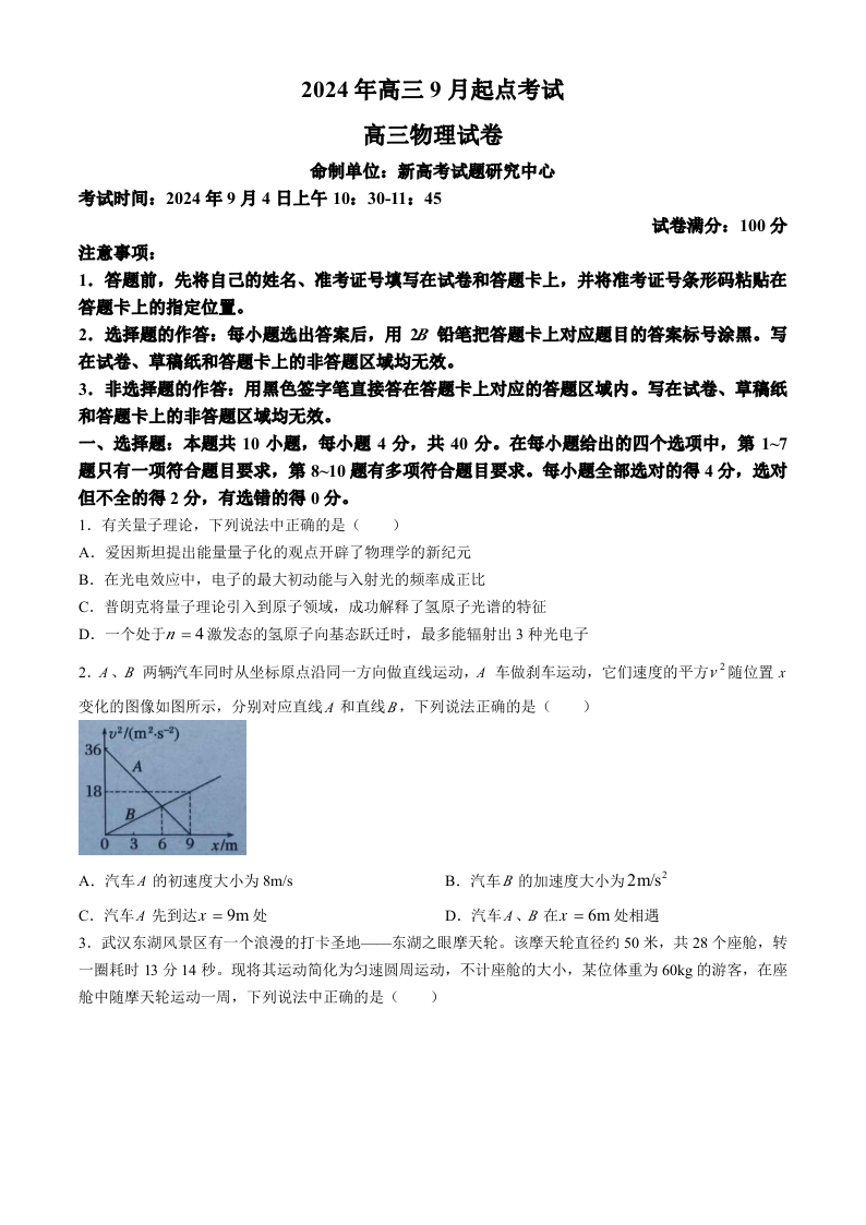 湖北省新高考联考协作体2025届高三上学期开学考试+物理