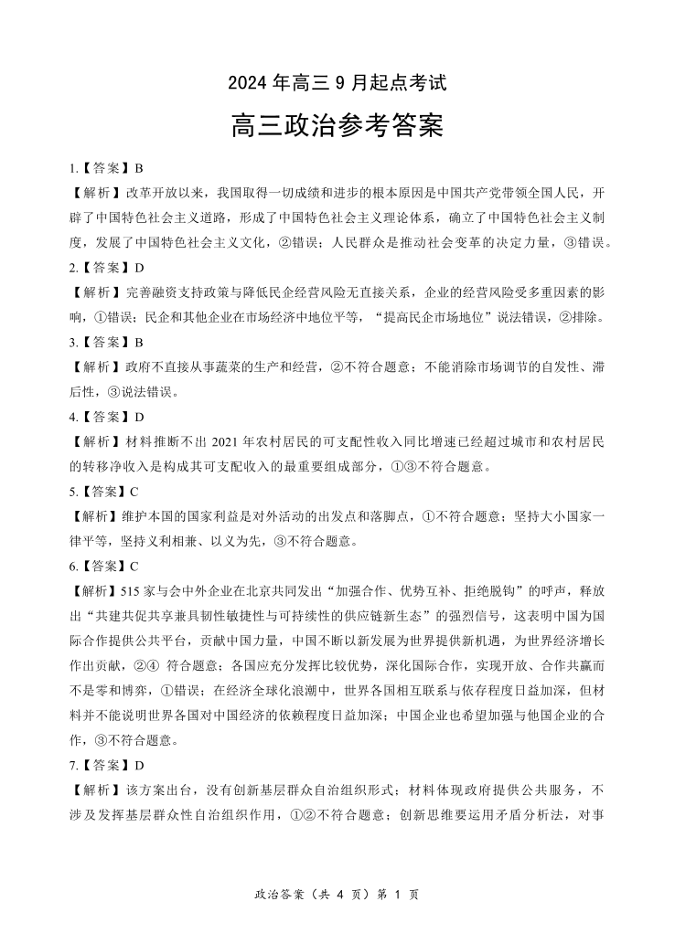湖北省新高考联考协作体2025届高三上学期开学考试+政治答案