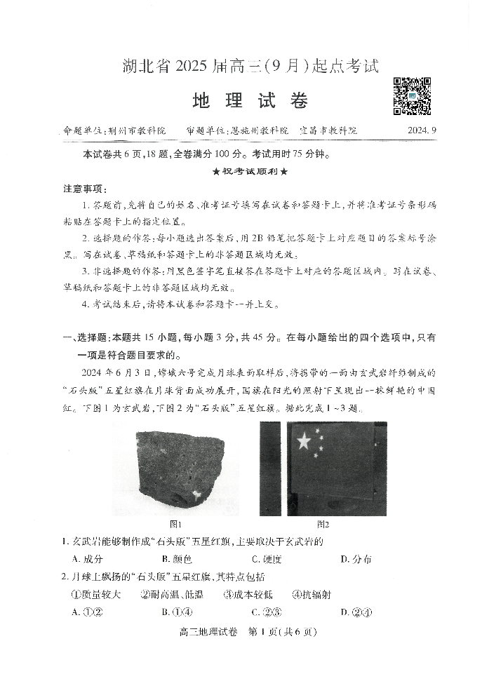 湖北省“宜荆荆恩”2025+届高三9月起点考试+地理