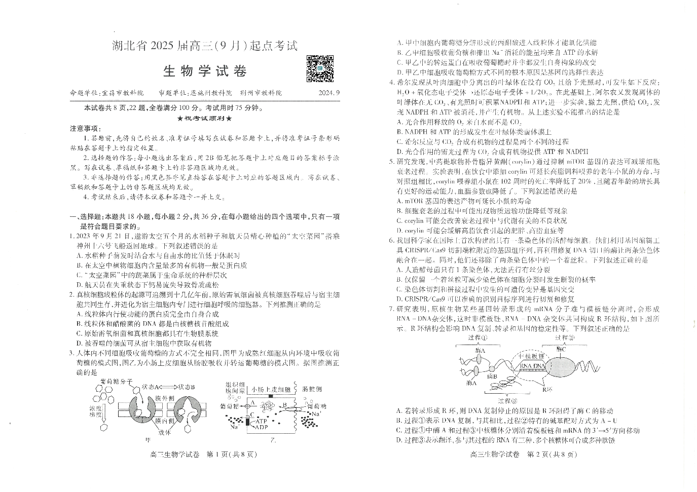 湖北省“宜荆荆恩”2025+届高三9月起点考试+生物学