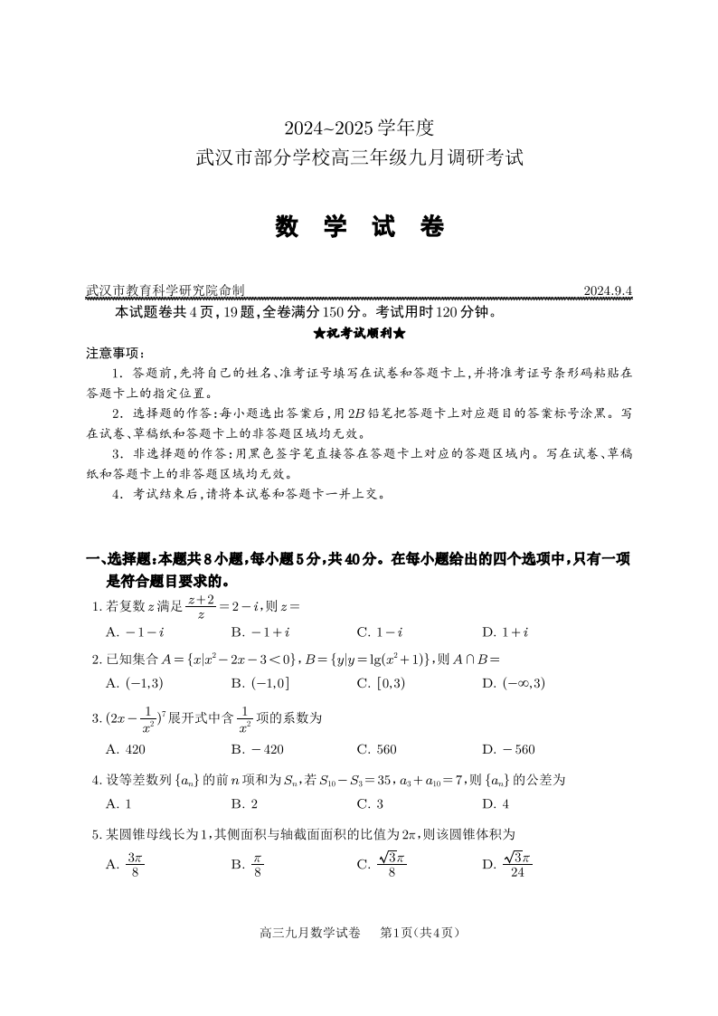 湖北省2024-2025学年度武汉市高三年级九月调研考试+数学