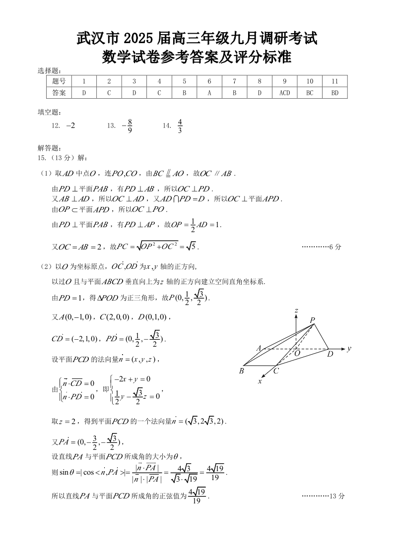湖北省2024-2025学年度武汉市高三年级九月调研考试+数学答案