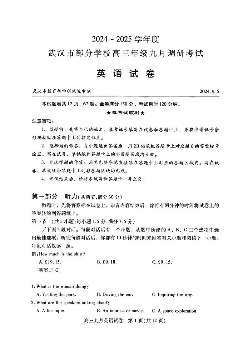 湖北省2024-2025学年度武汉市高三年级九月调研考试+英语