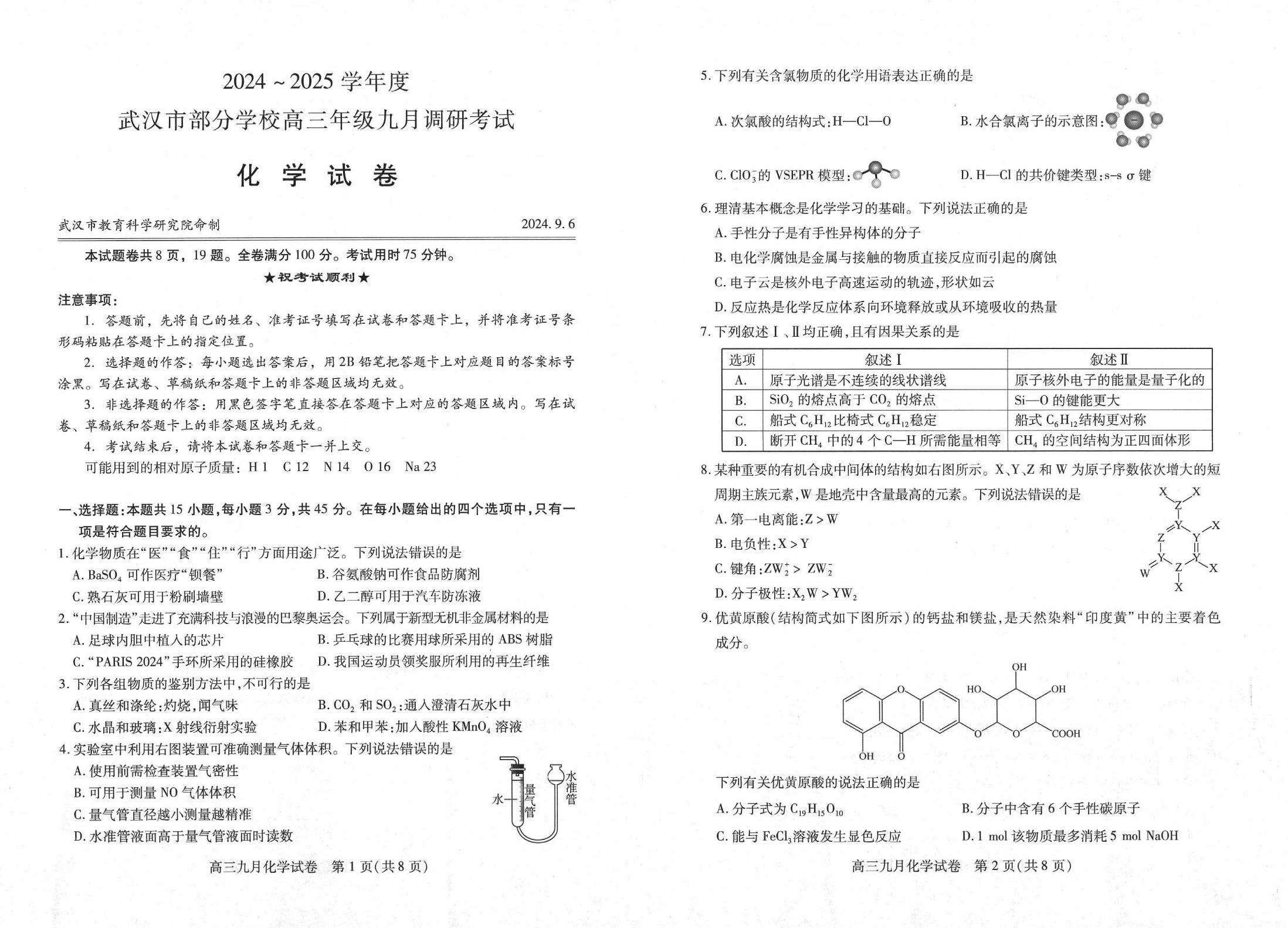 湖北省2024-2025学年度武汉市高三年级九月调研考试+化学