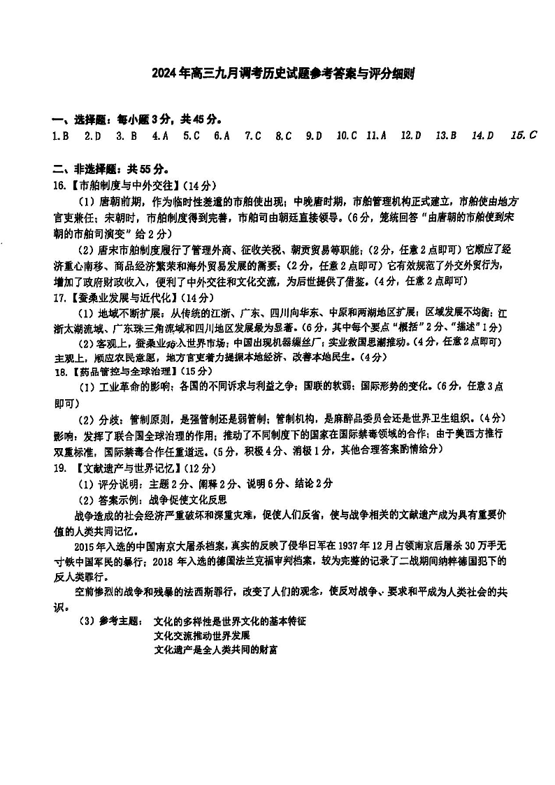 湖北省2024-2025学年度武汉市高三年级九月调研考试+历史答案