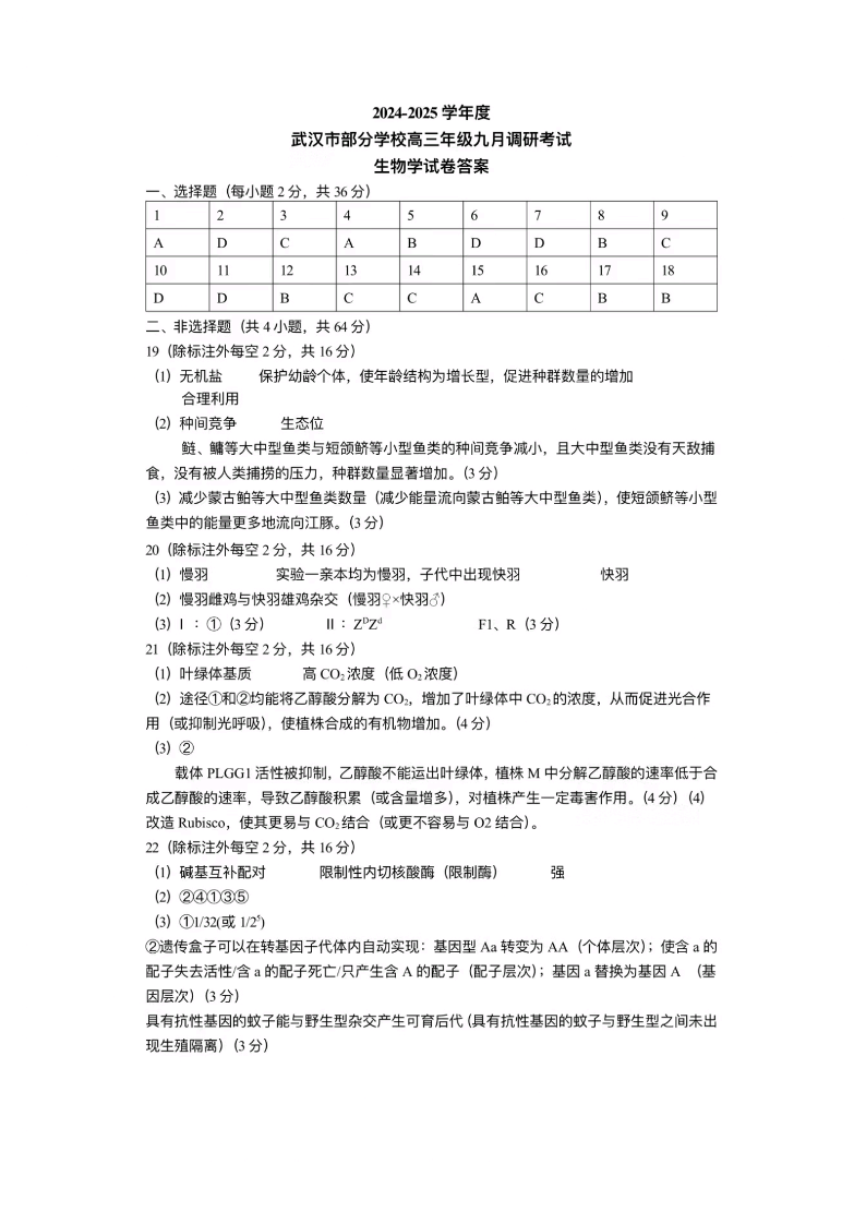 湖北省2024-2025学年度武汉市高三年级九月调研考试+生物答案