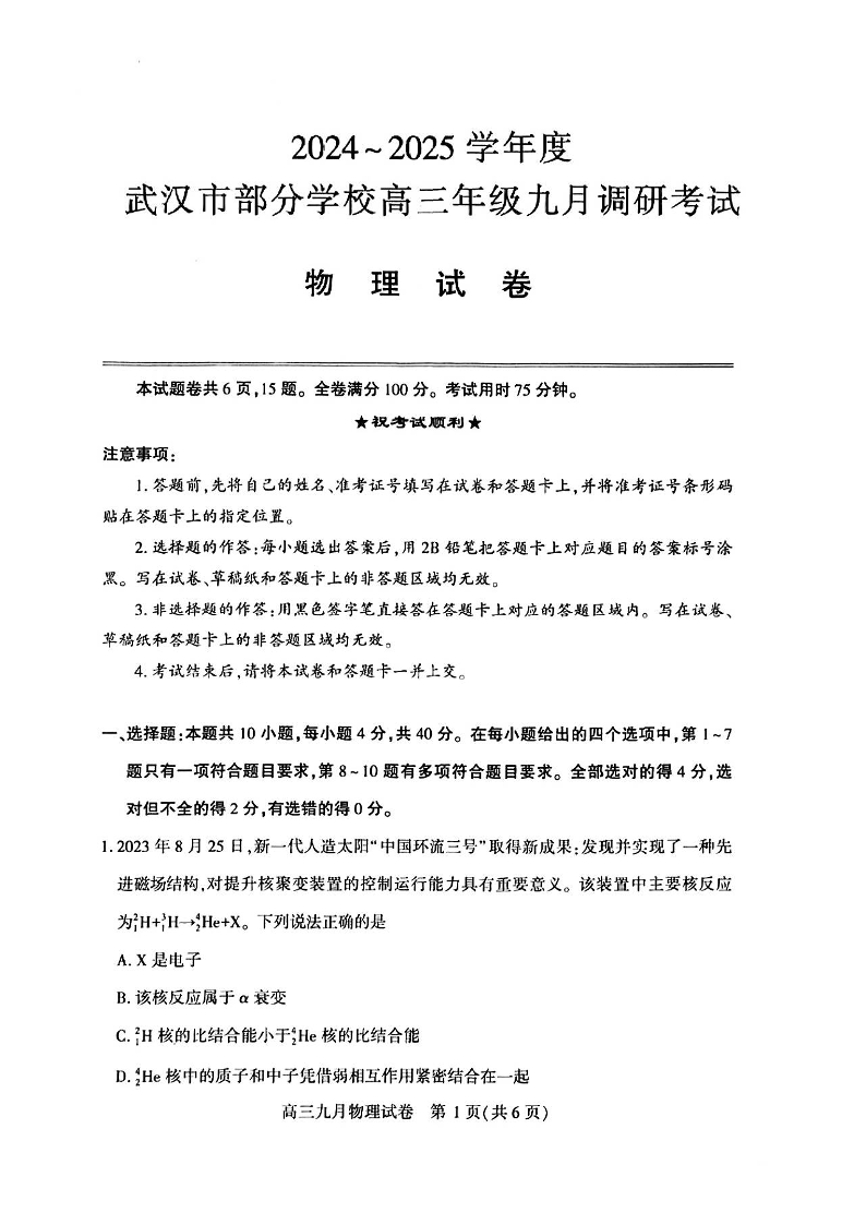 湖北省2024-2025学年度武汉市高三年级九月调研考试+物理