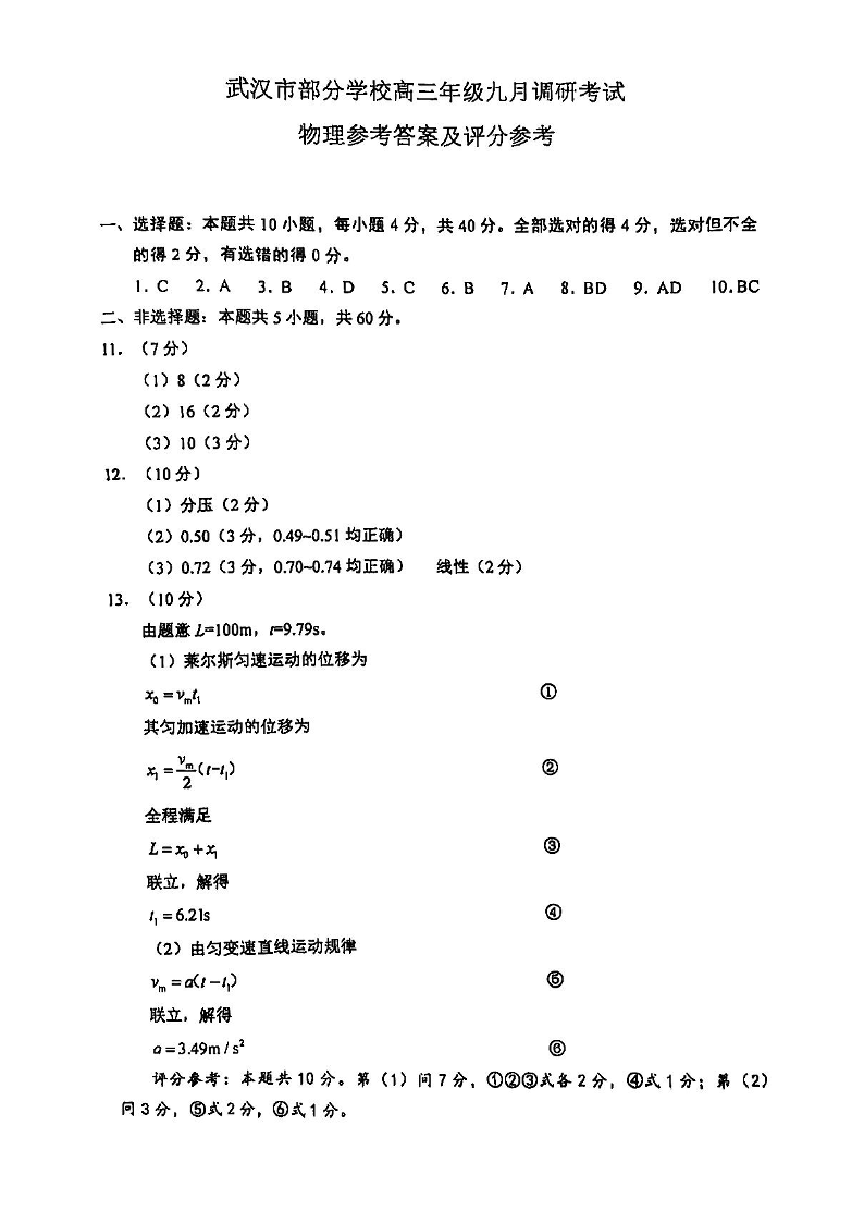 湖北省2024-2025学年度武汉市高三年级九月调研考试+物理答案