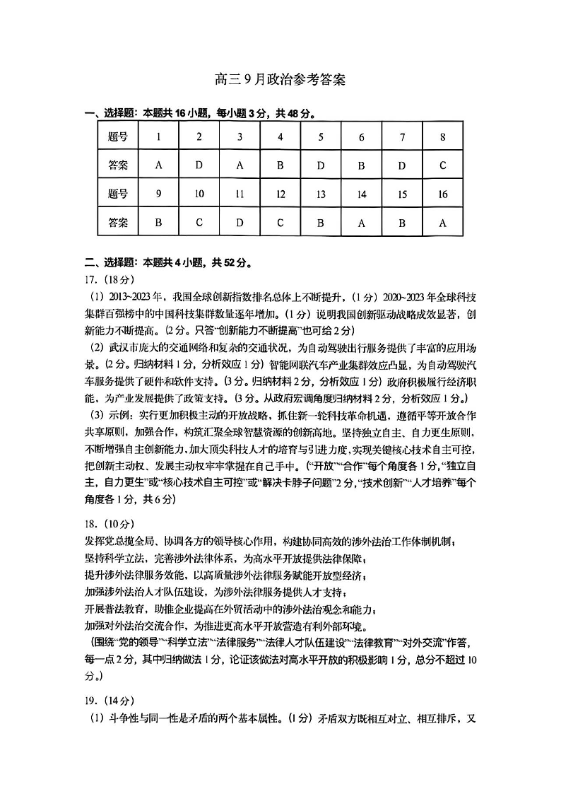 湖北省2024-2025学年度武汉市高三年级九月调研考试+政治答案