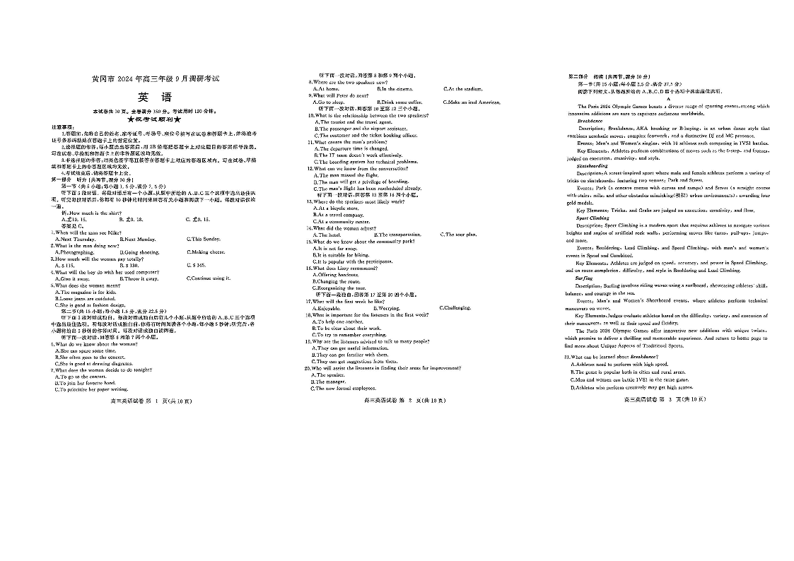 湖北省黄冈市2024年高三年级9月调研考试+英语