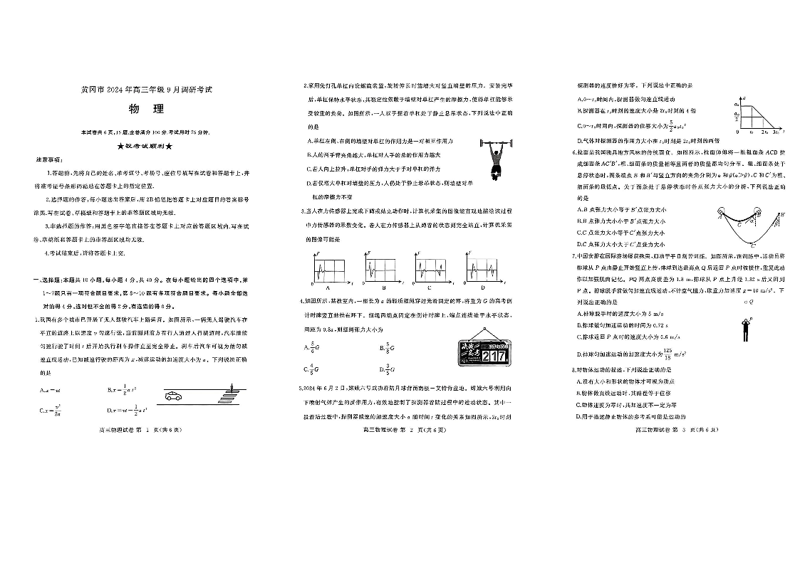 湖北省黄冈市2024年高三年级9月调研考试+物理