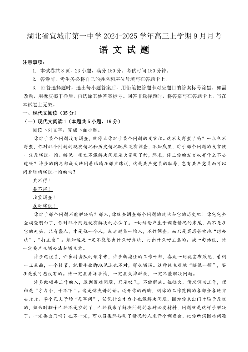 湖北省宜城市第一中学2024-2025学年高三上学期9月月考+语文