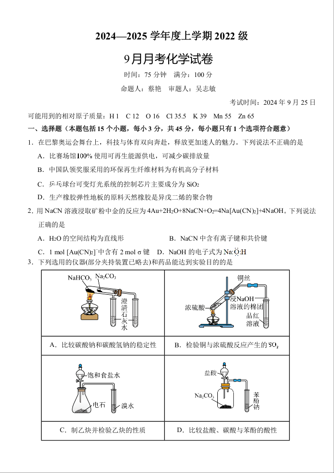 湖北省沙市中学2024-2025学年高三上学期9月月考试题+化学