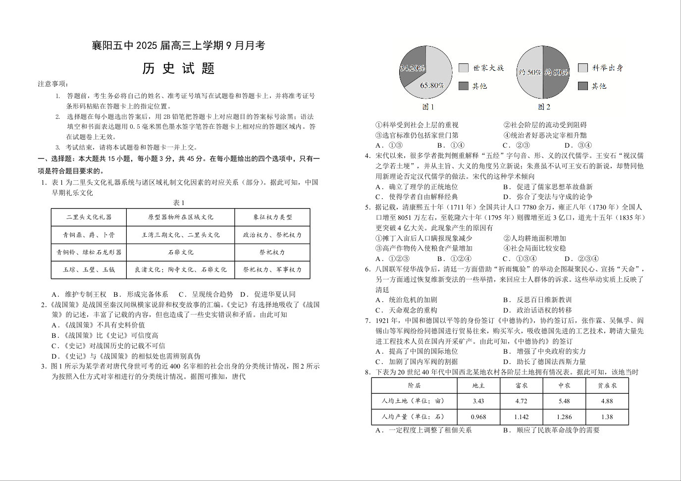 湖北省襄阳市第五中学2024-2025学年高三上学期9月月考+历史