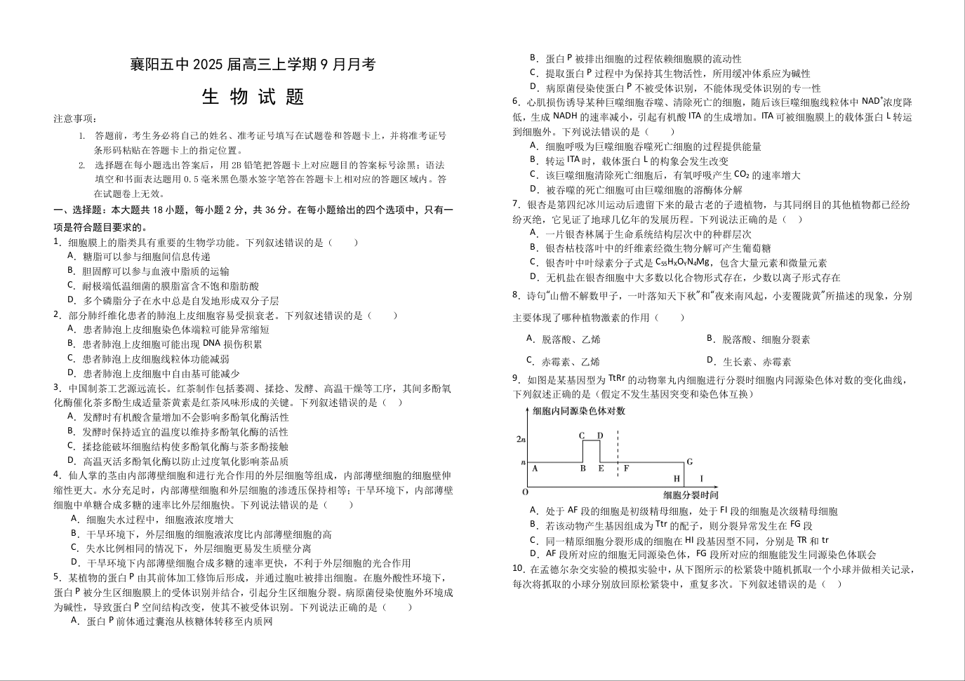 湖北省襄阳市第五中学2024-2025学年高三上学期9月月考+生物