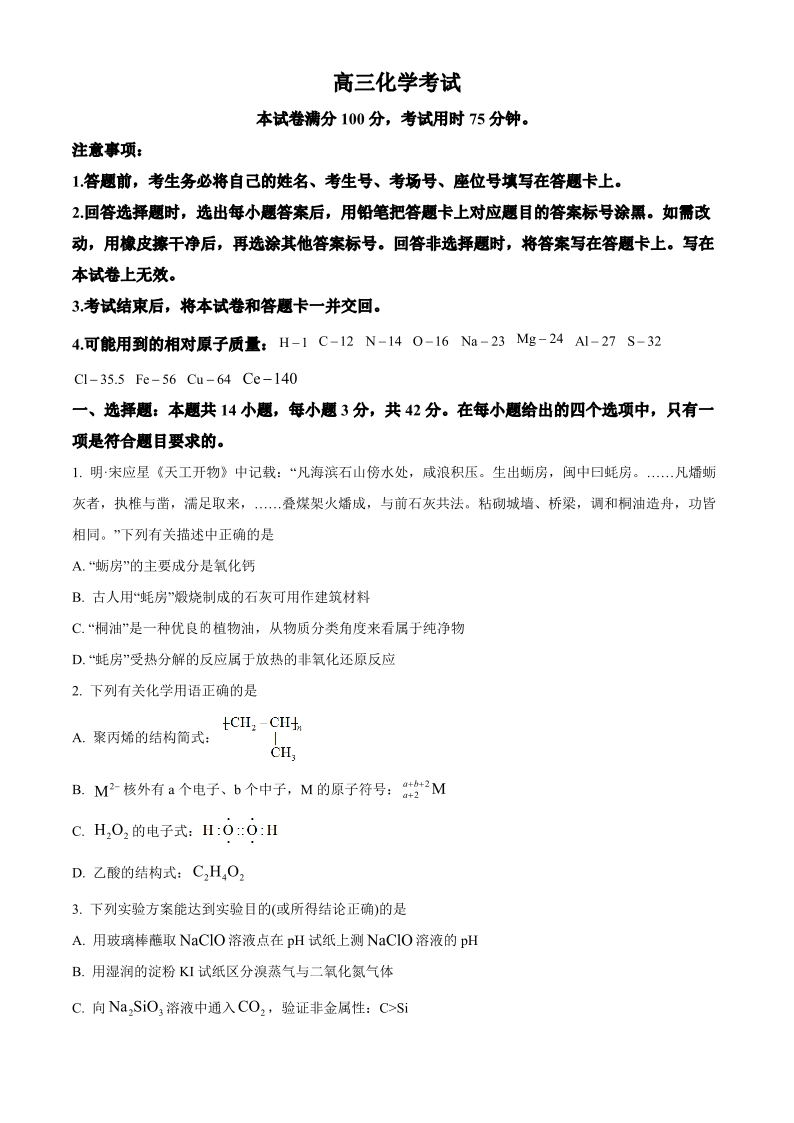 2024届湖南省衡阳市衡南县高三上学期11月期中考试 化学