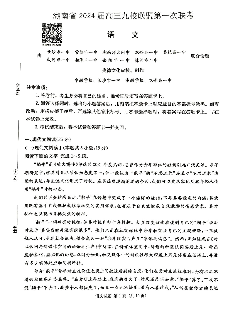 2024届湖南省湘东九校联盟高三上学期第一次联考(一模)语文