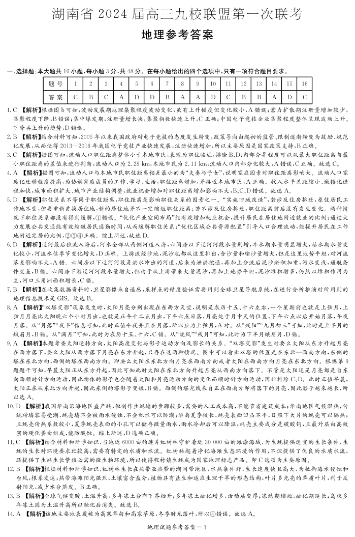 2024届湖南省湘东九校联盟高三上学期第一次联考(一模)地理答案