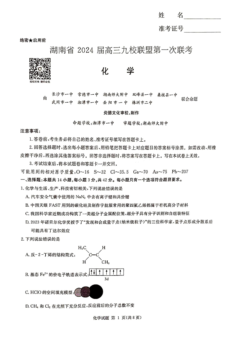 2024届湖南省湘东九校联盟高三上学期第一次联考(一模)化学