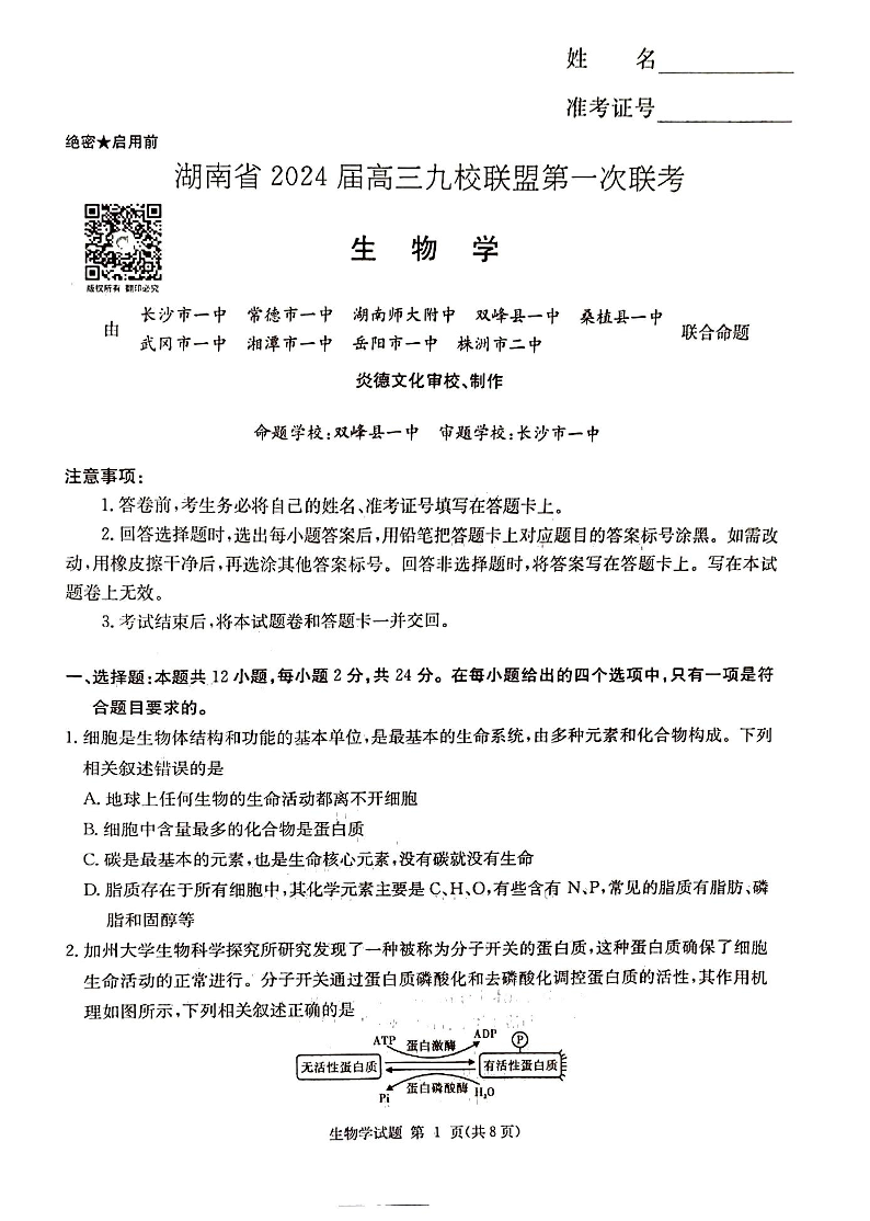 2024届湖南省湘东九校联盟高三上学期第一次联考(一模)生物