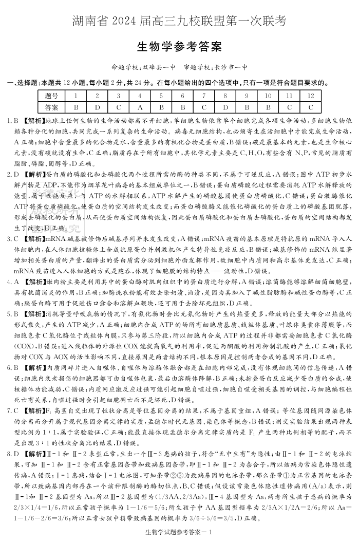 2024届湖南省湘东九校联盟高三上学期第一次联考(一模)生物答案