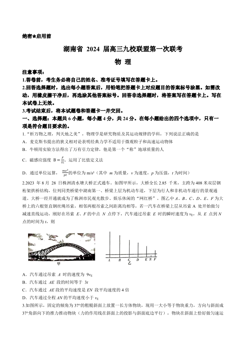 2024届湖南省湘东九校联盟高三上学期第一次联考(一模)物理