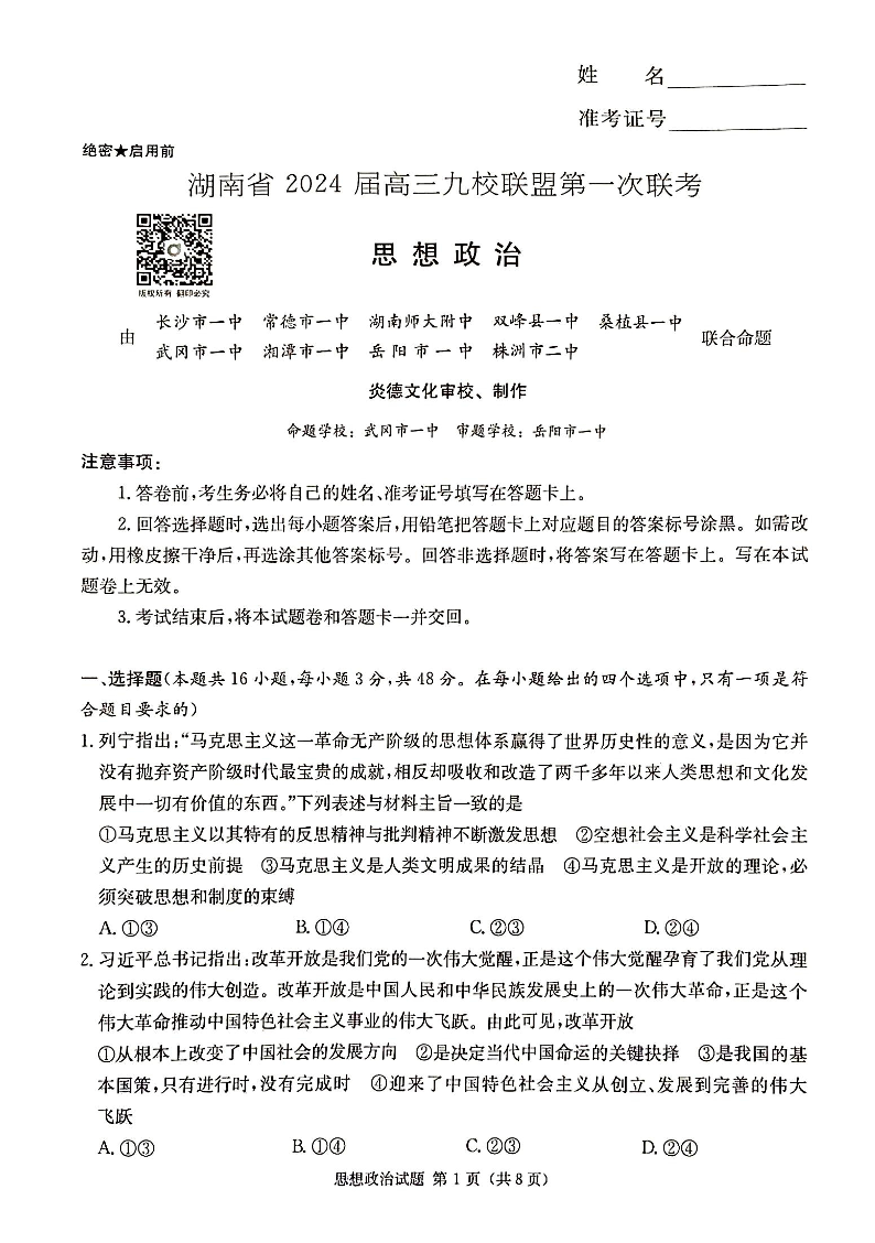 2024届湖南省湘东九校联盟高三上学期第一次联考(一模)政治