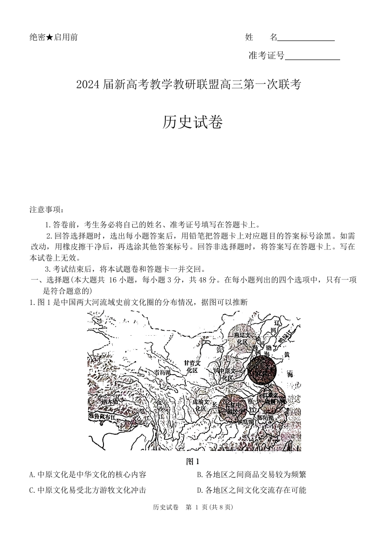 2024届湖南省新高考教学教研联盟高三下学期第一次联考 历史