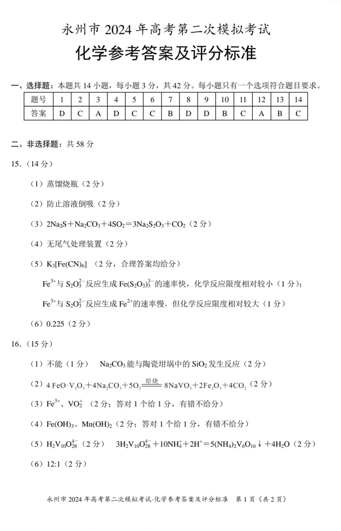 2024届湖南省永州市高三上学期第二次模拟考试 化学答案