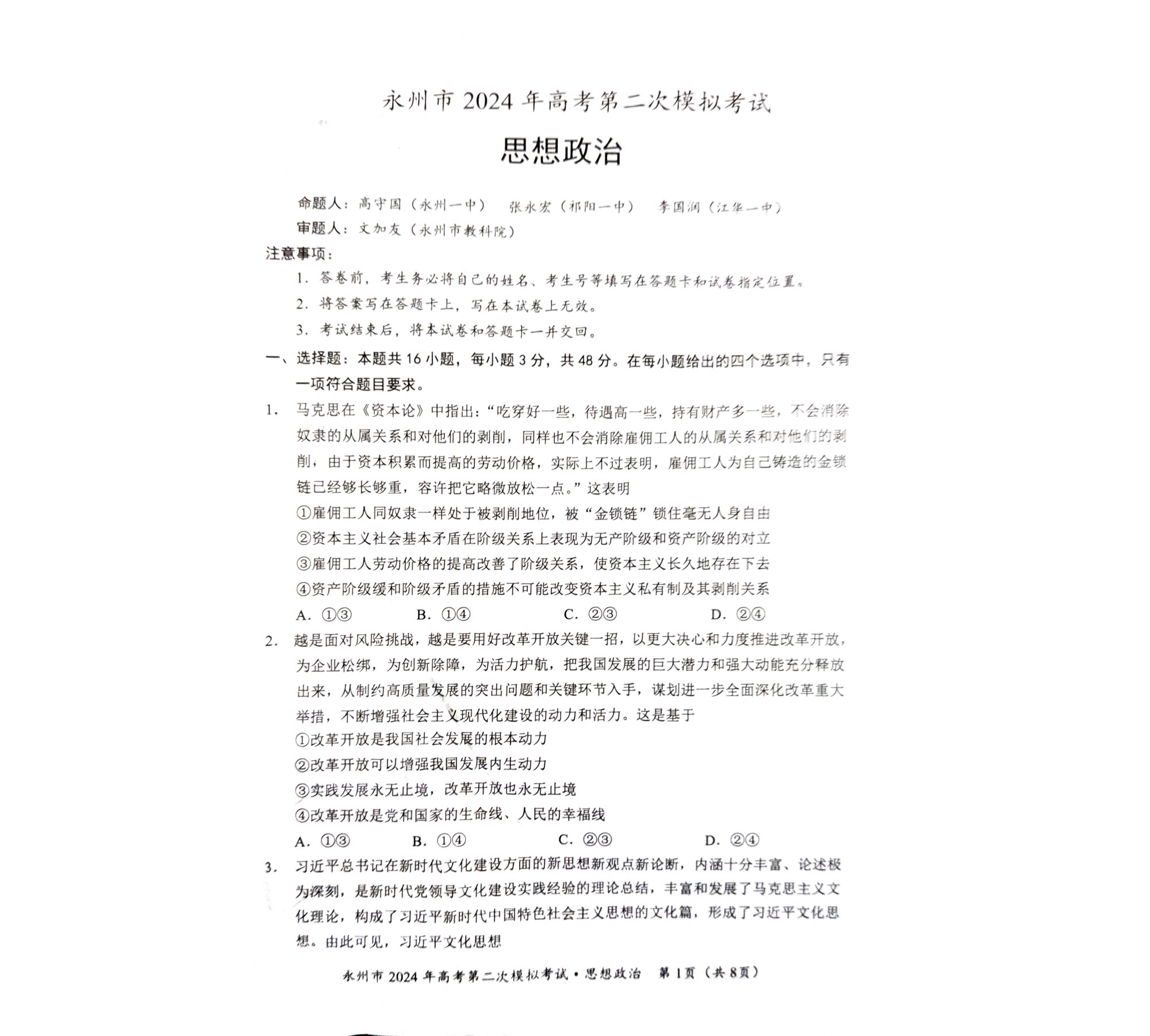 2024届湖南省永州市高三上学期第二次模拟考试 政治