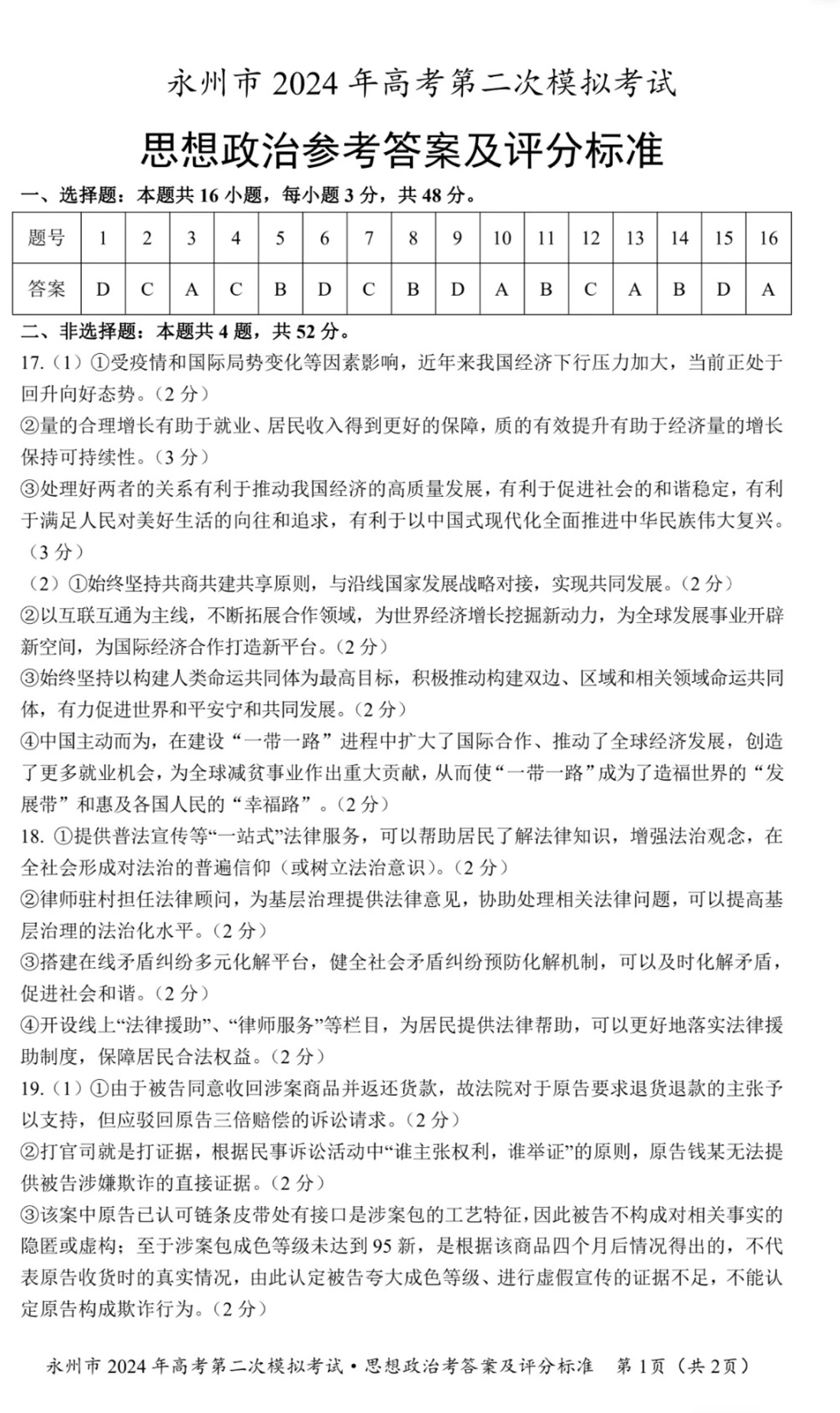 2024届湖南省永州市高三上学期第二次模拟考试 政治答案