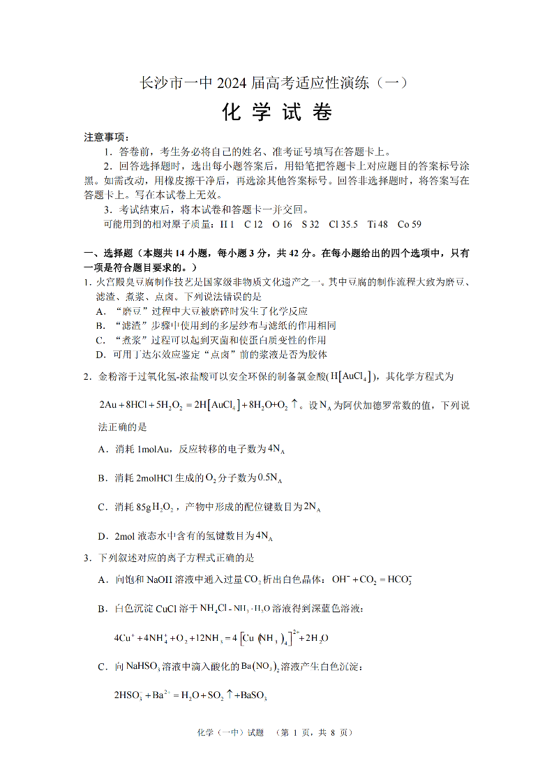 2024届湖南省长沙市第一中高三下学期高考适应性演练(一)化学